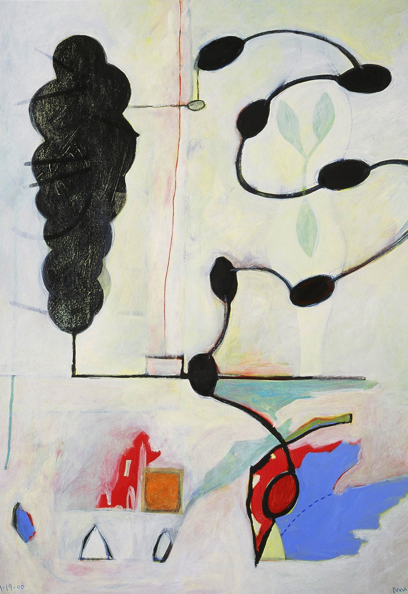 This large acrylic painting on 100% rag paper is an organic abstraction that deals with my interests at the time in "above/below" themes, such as consciousness and subconsciousness and observable and invisible forms or energy. The black shape represents a cocoon-like entity while the passage to the right is about travel represented by the abstract presentation of roads and cities on a map. There is some beautiful, subtle under-painting that shows through the larger areas of light green.