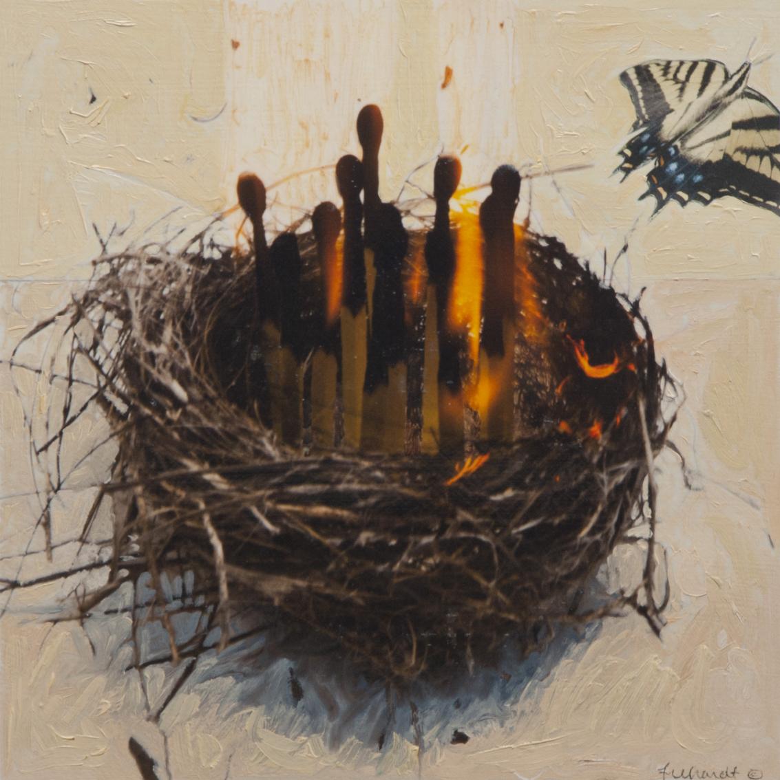 This piece is a reflection on how drought impacts our landscape, as well as our wildlife. During my process, I take many still life photos to see how the elements work together. I have a collection of bird nests and other objects that I have collected. Once the photos are taken, I sort through and find the images I feel have the most impact. If I like what I see, I make an archival ink jet print and then I paint around the image. I like the difference between the preciseness of the photo against the more painterly qualities of the background.
