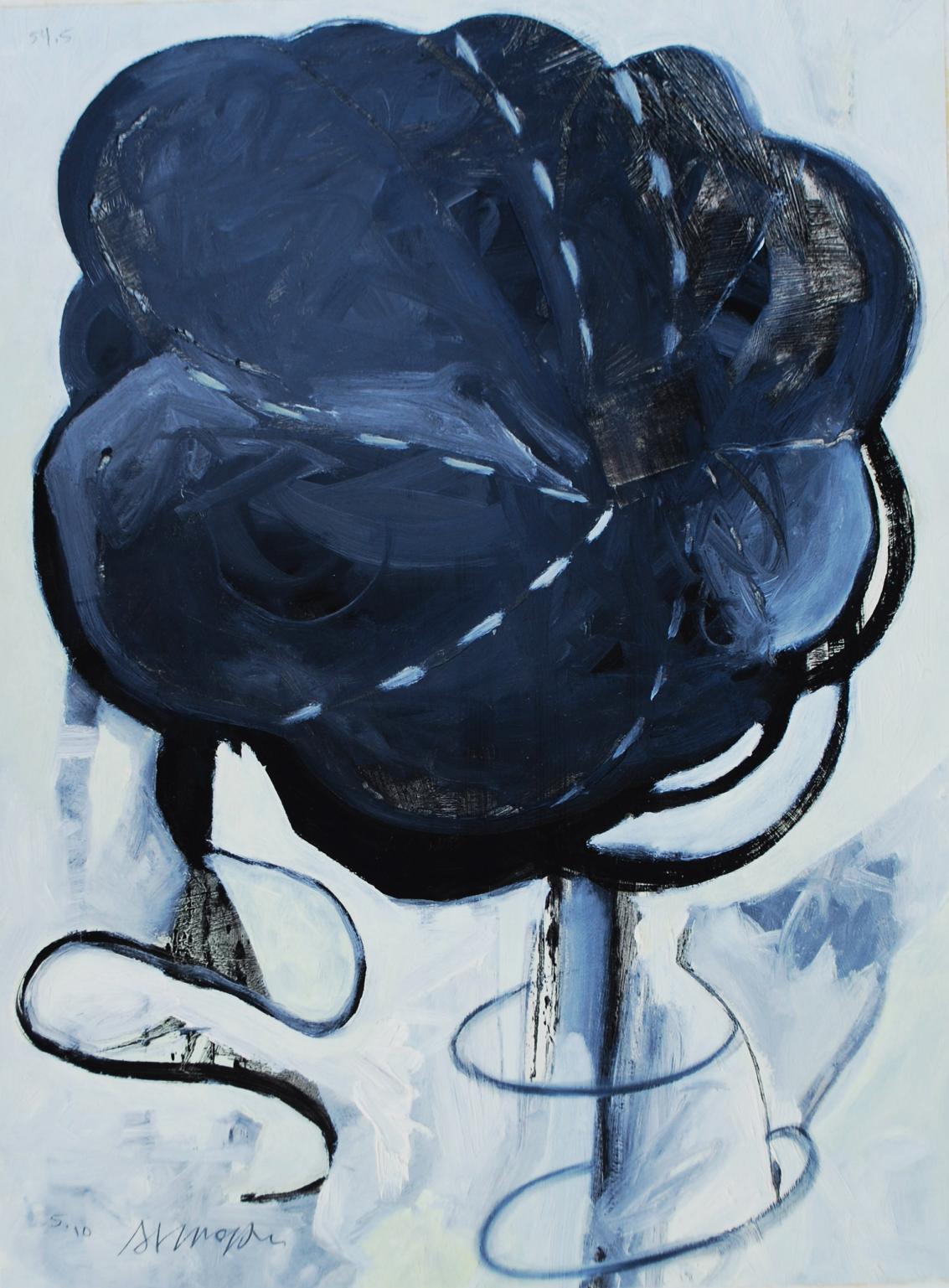 This oil on paper painting is from a series of smaller abstractions that refer to the human body, physiologically as well as metaphysically. With its reserved palette of light green tints and dramatic blacks, the bulbous form of the id hovers heavy in space.